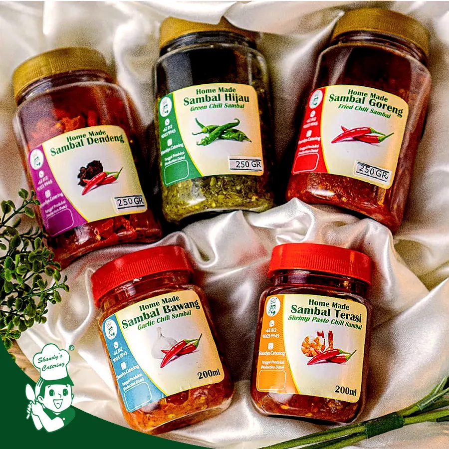 Aneka Sambal Praktis Shandy's Catering yang lezat dikemas dalam kemasan botol +/- 200 gram.