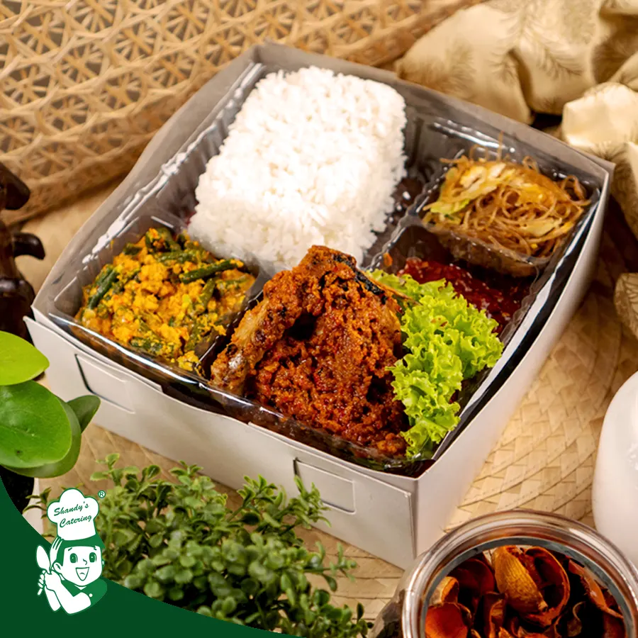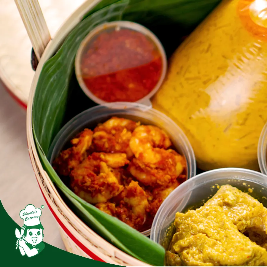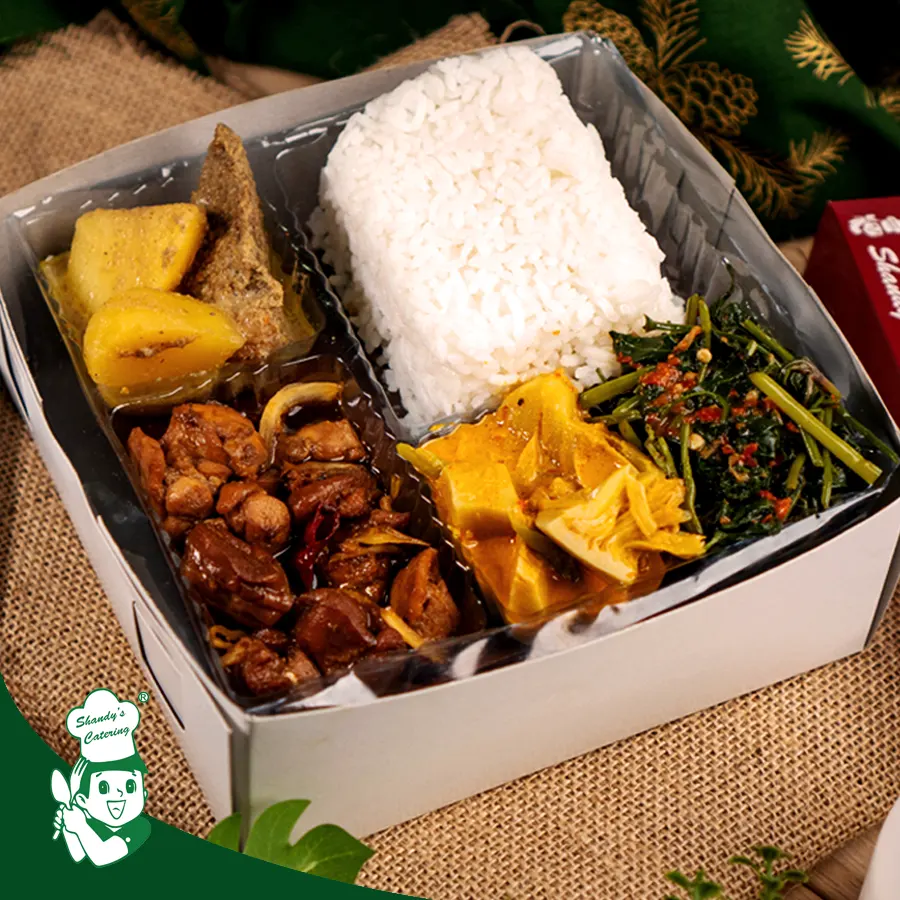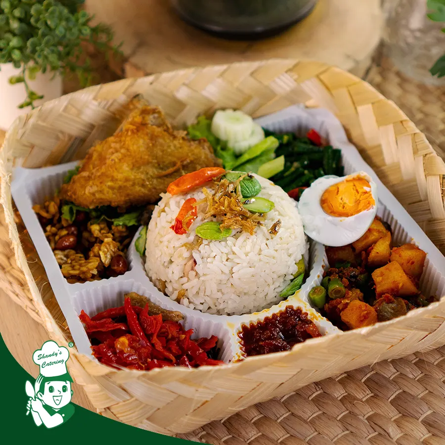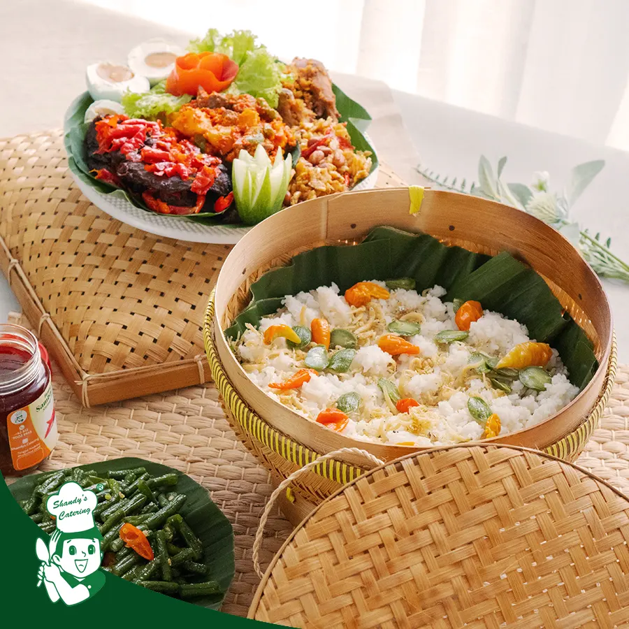 Paket Nasi Bakul Spesial ala Shandy's Catering cukup untuk porsi 5 pax dan sudah termasuk beragam lauk pendamping.